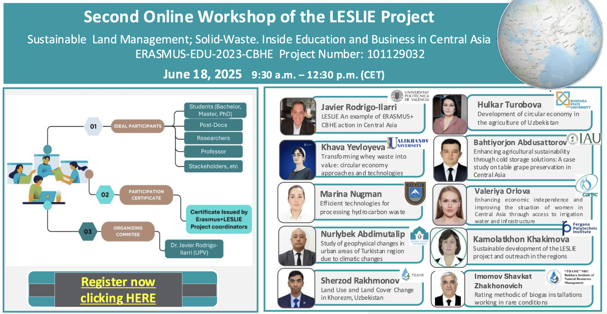 The workshop will be opened by LESLIE coordinator, Prof. Javier Rodrigo-Ilarri, who will introduce the keynote lecture: “LESLIE: An example of ERASMUS+ CBHE action in Central Asia”. His talk will highlight the strategic goals of LESLIE in advancing academic capacity and promoting cross-border collaboration in environmental education.